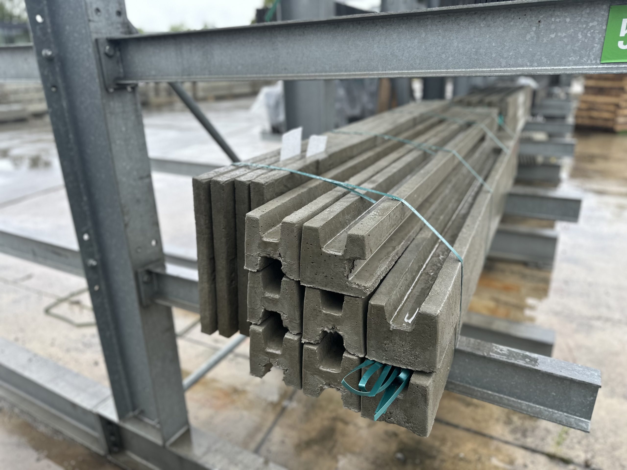 Außerdem sind die Pfosten immer länger als die gewünschte Zaunhöhe. Es ist wichtig, dass dieser Überstand vorhanden ist, damit die Betonpfosten stabil befestigt werden können. In der Regel werden sie mit einem Punktfundament verankert. Abhängig von der Ausführung hat jeder Pfosten ein oder zwei eingelassene, nicht durchgehende Nuten. Bei einseitigen Motiven beträgt die Breite dieser Nut etwa 35 mm. Bei doppelseitigen Motiven ist die Breite der Nut ca. 60 mm. Um sicherzustellen, dass auf beiden Seiten des Zauns ein Motiv zu sehen ist, werden zwei Motivplatten Rücken an Rücken in diese Nut eingesetzt. Jede Seite der Motivplatten sitzt mit ihrer Feder ungefähr 20 mm tief in den Pfosten. Das Pfostenprofil ist bei einseitiger Konstruktion 110 × 110 mm und bei beidseitiger 130 × 130 mm. Die Pfosten sind sämtlich in der natürlichen Farbe Naturgrau gehalten